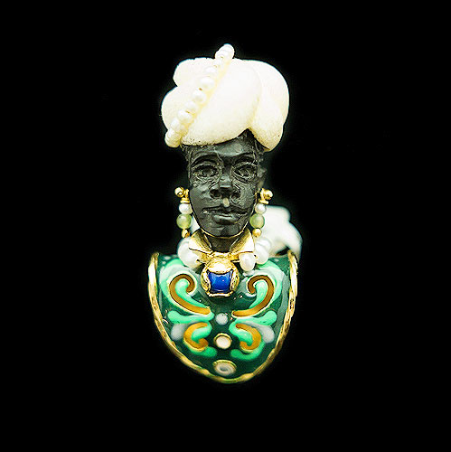 Estilo: italiano. Anillo plata dorada Moretto veneciano con esmalte verde, espuma de mar y ébano