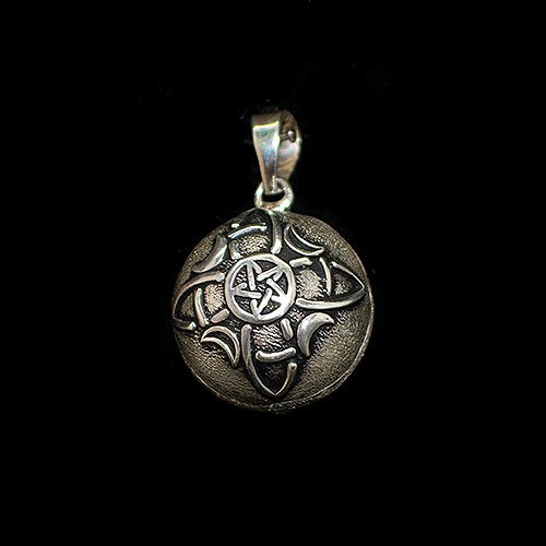 Modelo: 001940062 Colgante de plata llamador de ángel avejentado con el símbolo de el nudo de bruja y el pentagrama con las fases lunares. El Nudo de Bruja, un símbolo ancestral profundamente arraigado en la cultura celta, ha sido venerado a lo largo de los siglos por su simbolismo mágico y su capacidad de ofrecer protección. Este amuleto sirve como un poderoso escudo contra hechizos y energías adversas. Su origen, ligado a antiguas prácticas de brujería, refleja una profunda conexión con la espiritualidad y las fuerzas naturales, otorgando no solo seguridad sino también un puente hacia el conocimiento ancestral.