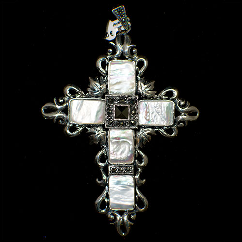 Modelo: 000920802 Cruz latina de plata estilo barroca con Nácar y marcasitas y granate central. La cruz Latina también conocida como crux ordinaria en latín, es el símbolo más usado por las diferentes confesiones del cristianismo. Representa la muerte de Jesucristo y su resurrección posterior, conforme a los textos del Nuevo Testamento.