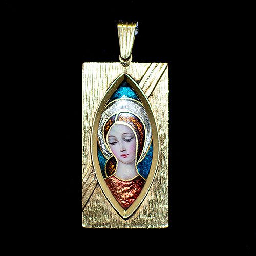 Modelo: B00017763 Medalla de oro amarillo de 18k con decoraciones cinceladas y, en el centro, una imagen de la virgen esmaltada en cloisonné.